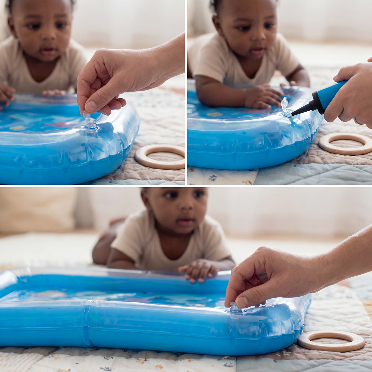 This baby water tummy time mat is designed to offer a soft, cushioned surface for supervised floor use. The smooth outer material provides a gentle contact point with the skin, while the water filled center creates a squishy, pressure diffusing layer that helps distribute weight more evenly across the mat. This combination of materials aims to reduce localized pressure points and increase overall comfort during use.